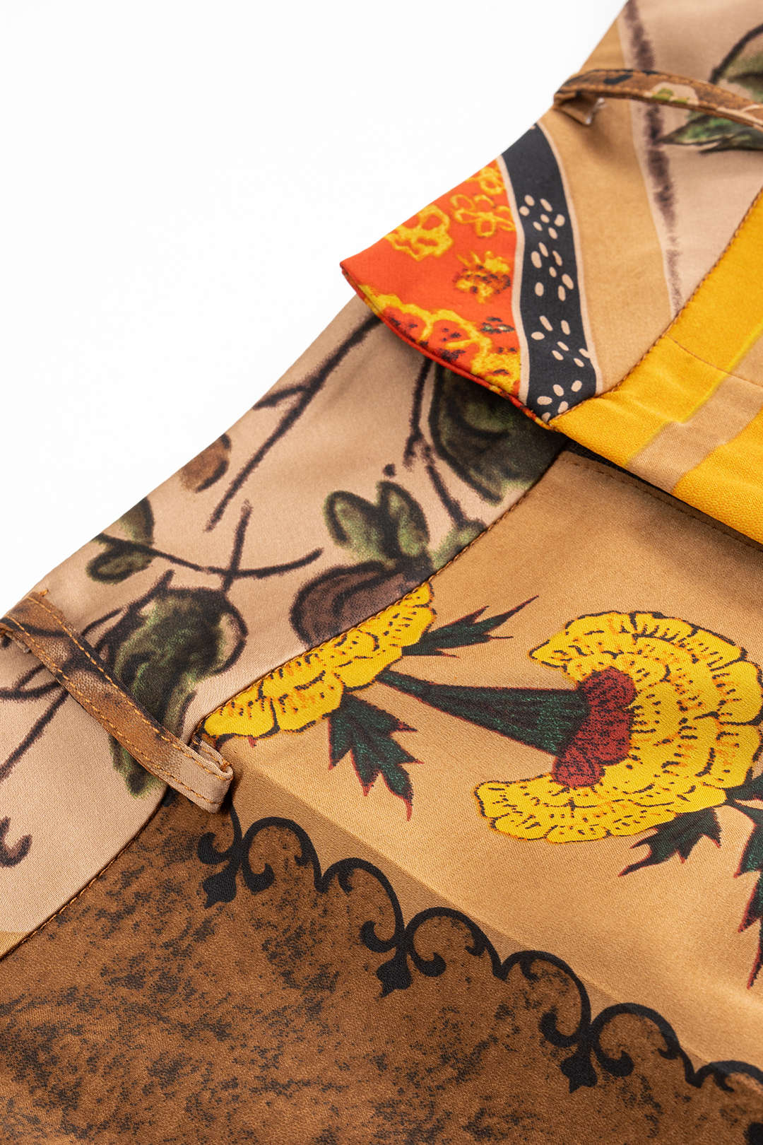 Make a bold style statement with this eye-catching vintage-inspired A-line skirt. Crafted from a non-stretch plain cloth blend of 95% polyester and 5% elastane, it features a loose fit and unique patchwork design with artistic prints and vibrant tones of mustard, brown, and gold. Each piece is one of a kind—print and colour placement may vary slightly, adding to its charm. Ideal for casual outings or creative styling, this skirt combines comfort and personality effortlessly.